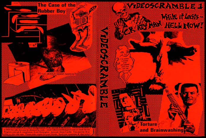 VIDEOSCRAMBLE is more insane. From Baltimore it is much more mondo oriented with clips from the Unarians, old TV commercials, fucked up Christian TV shows, some REALLY nasty poop play, a fat, disgusting S+M dominatrix punishing the shit out of a female slave doing things like blowing some painful looking darts into her ass like it is a dartboard or humiliating this really old dude. the infamous Crispin Glover on David Letterman makes an appearance here and for years this was the only place you could see it. This one is long, almost two hours.